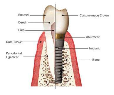 A dental implant is an artificial tooth root that a periodontist places into your jaw to hold a replacement tooth or bridge. Dental implants are natural looking. They are more tooth-saving than traditional bridgework, since neighboring teeth are not altered or necessary for support. Endosteal (in the bone) implants are the most commonly used type (see illustrations below). Dental implants are a viable option in the treatment of partial and full edentulism. The ideal candidate for a dental implant is in good general and oral health. They are considered an excellent option for tooth replacement.